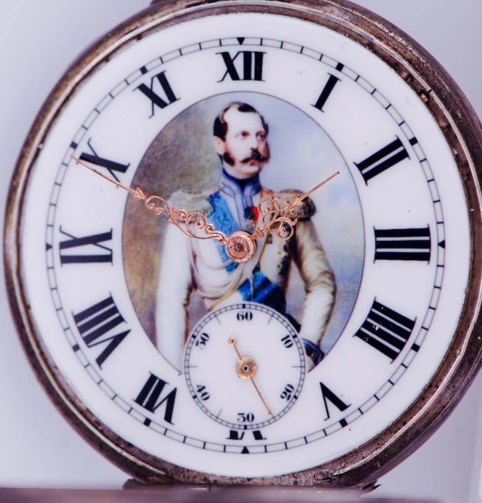 The watch has a fine enamel dial depicting a portrait of Tsar Alexander II The Liberator.