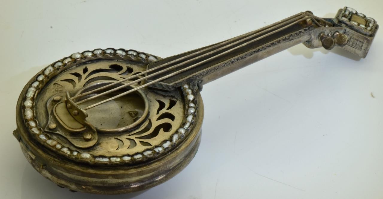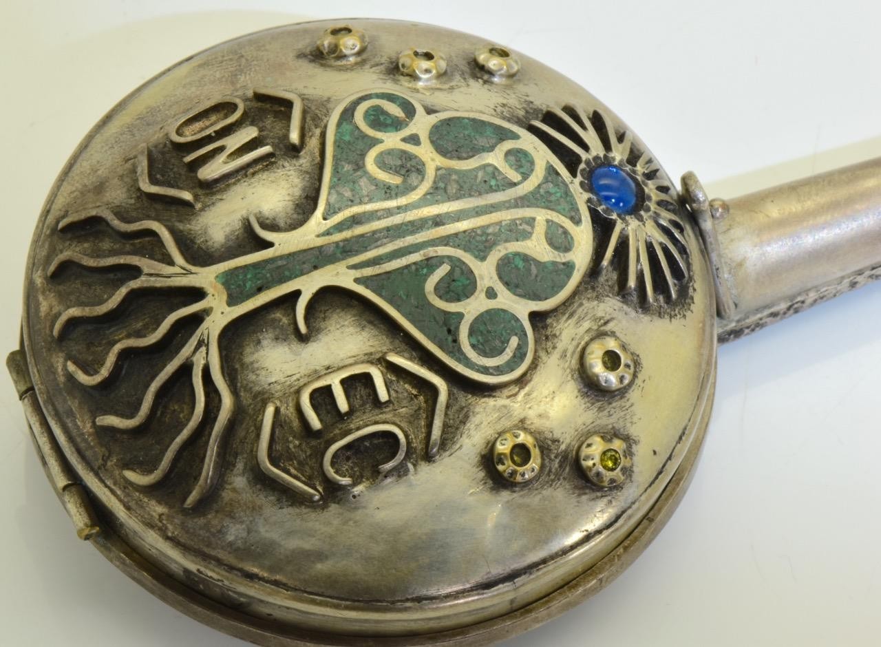 I am please to offer from my private collection this antique late 19th Century Imperial Tsar’s Era Masonic Silvered,Malachite&Pearls Mandolin box for pocket watch. It can hold one watch up to 50mm. The watch on the photo is NOT included. It is for demonstartion purpouse only. 15.5cm long. Decorated with natural pearls and Malachite intarsia hand work. Also decorated with various semi precious stones. Hand pierced and engraved.