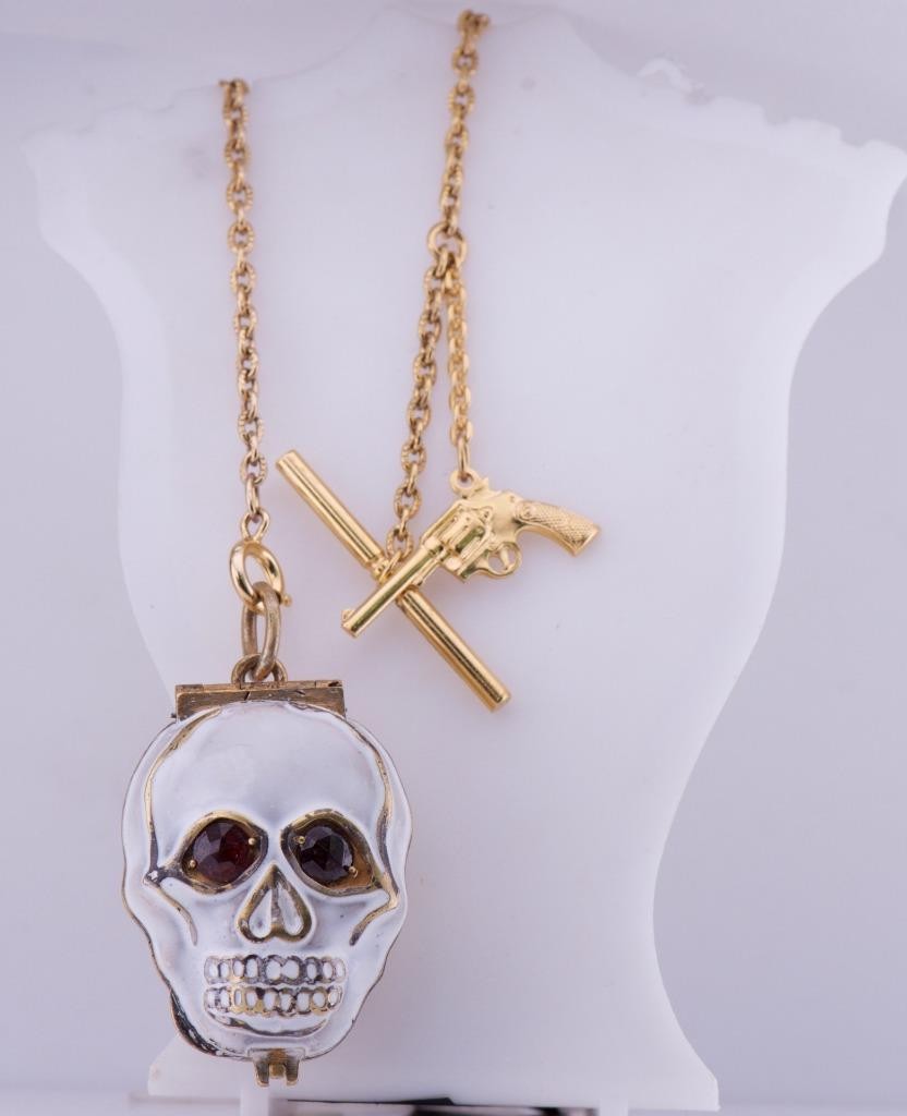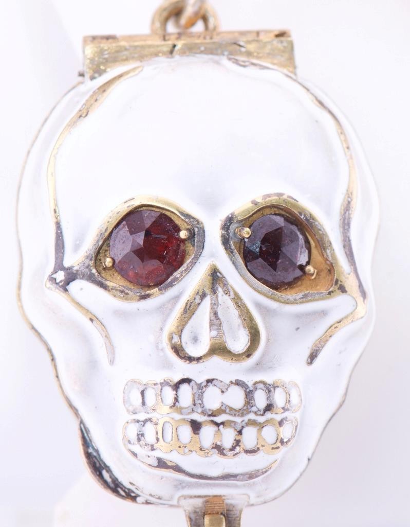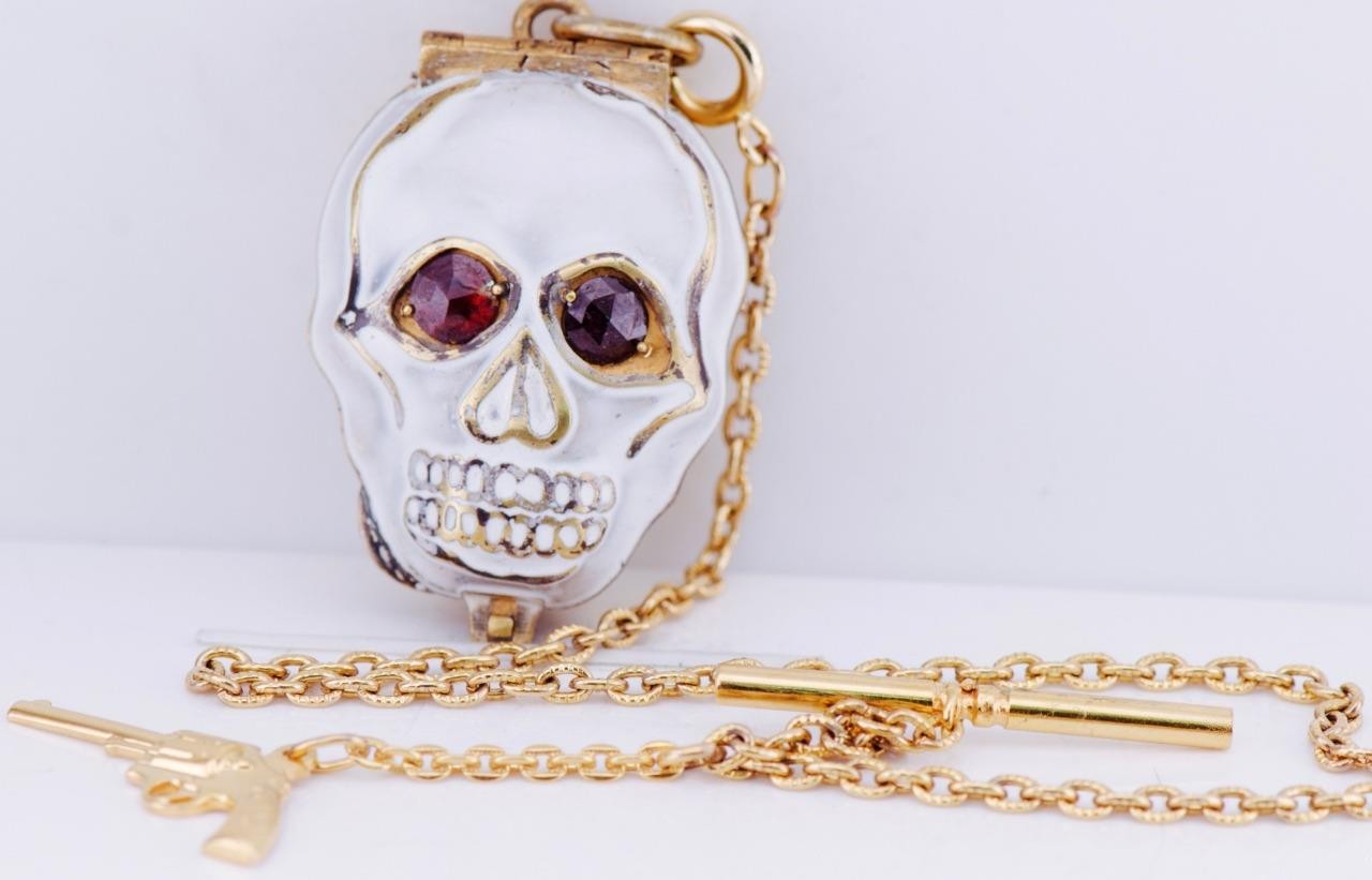 I am pleased to offer from my private collection this rare antique early 19th Century French Occultist’s Verge Fusee gilt silver&enamel Memento Mori Skull shaped case pocket watch and matching gilt chain fob c1815.