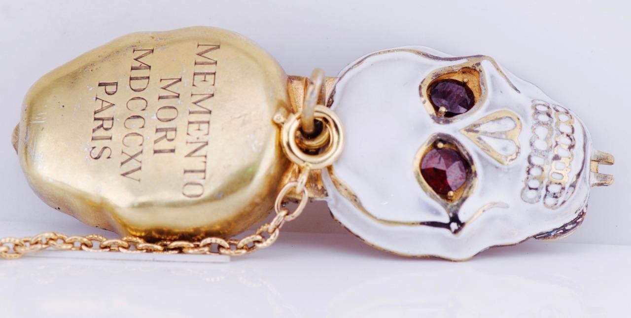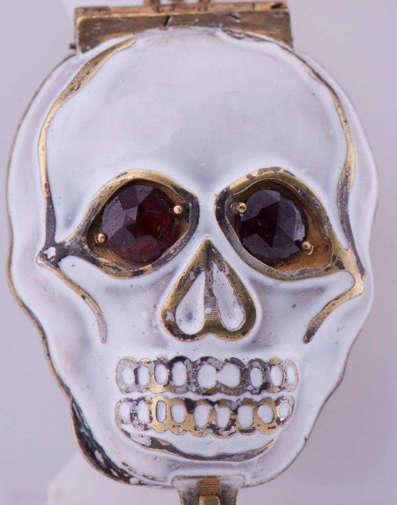 Excellent original overal condition. The case is gilt silver,made in the form of a skull.Decorated with Garnet precious stones in the eyes. The back in engraved “Memento Mori,1815,Paris” Original hands. All the parts original.