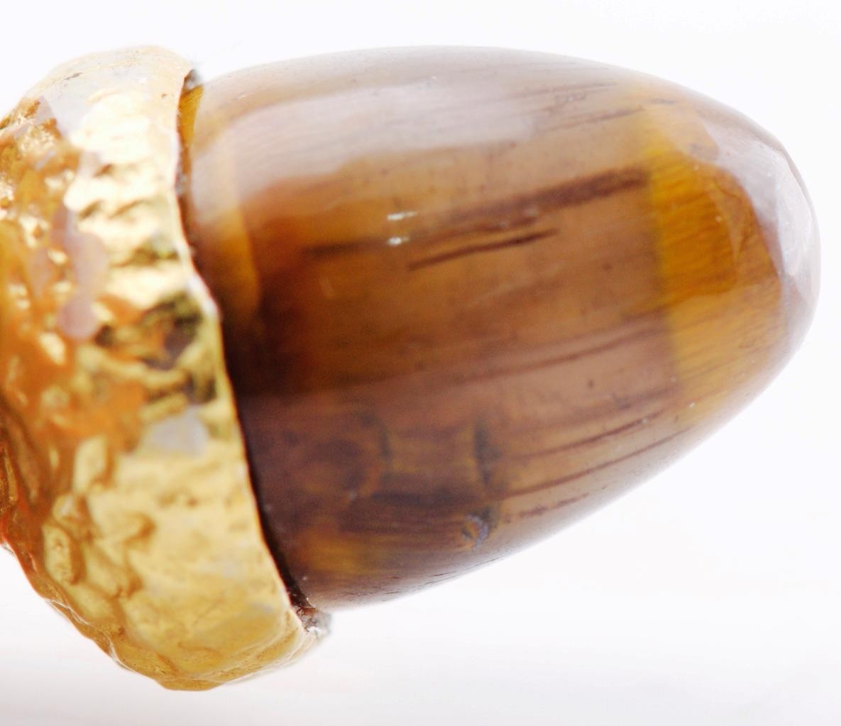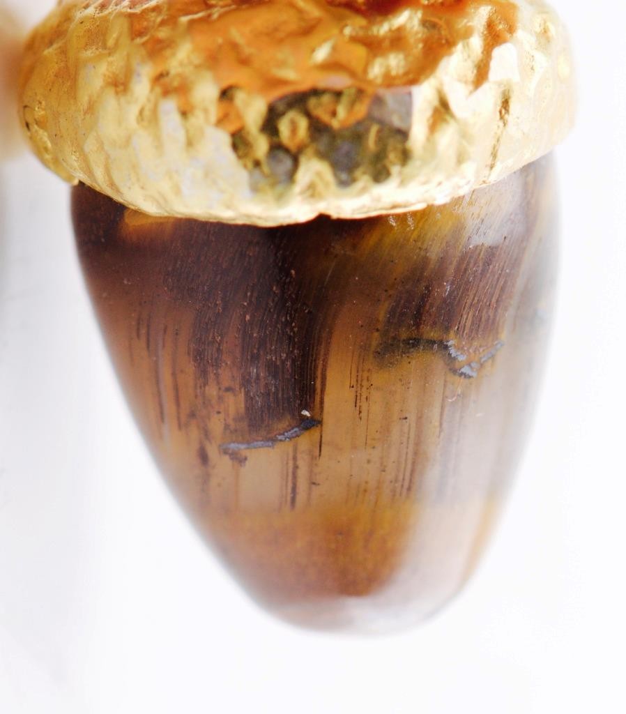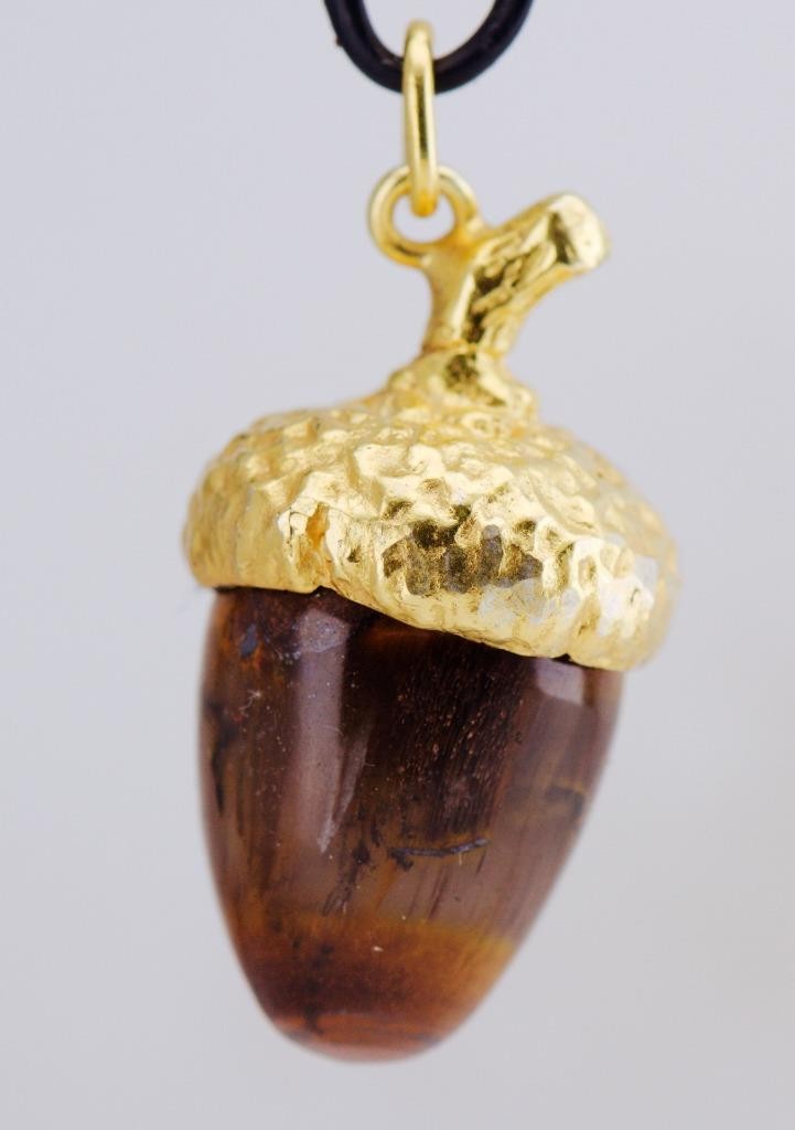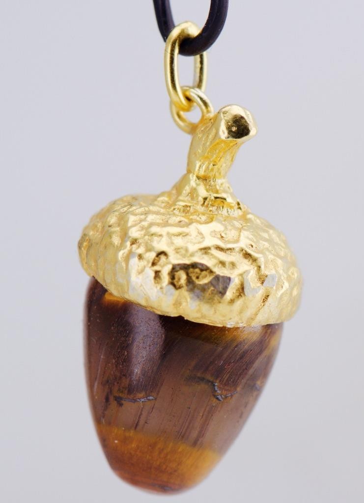 • The Gilt Silver Cap: The cupule (the cap of the acorn) and the stem bail are crafted from solid silver, finished with a heavy gold gilding. The metal has been beautifully chased and textured to replicate the intricate, organic roughness of a real acorn cap, creating a striking contrast against the smooth agate.