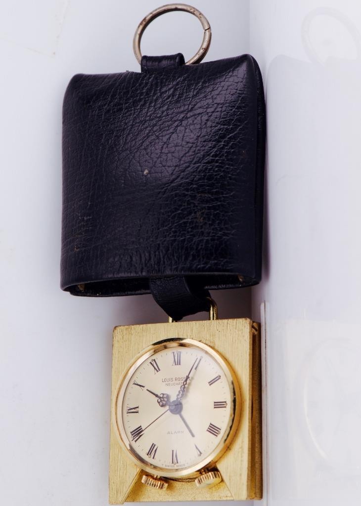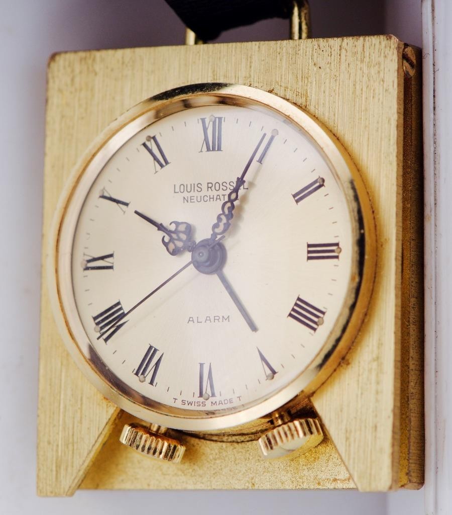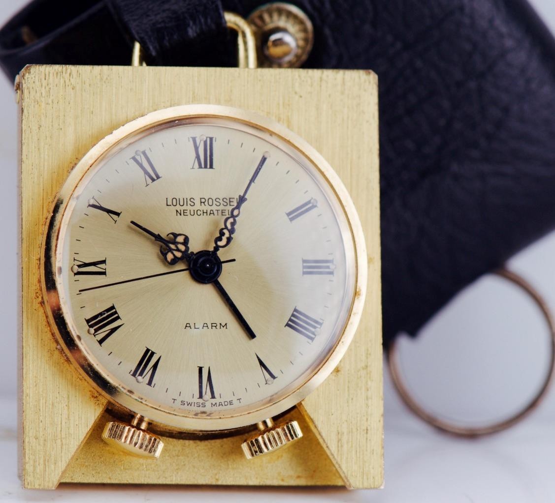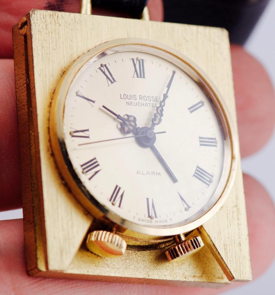 Up for sale is a stunning Louis Rossel Neuchatel travel alarm watch. Known for their distinct 1960s and 70s Swiss designs, Louis Rossel pieces are highly collectible for their reliability and unique aesthetic. This particular model features a robust 39mm gilt case that remains in exceptional, “perfect” condition—a rarity for travel timepieces of this age.
