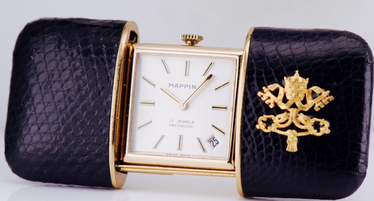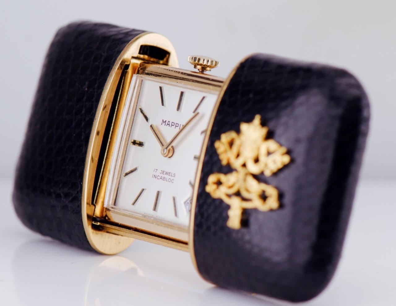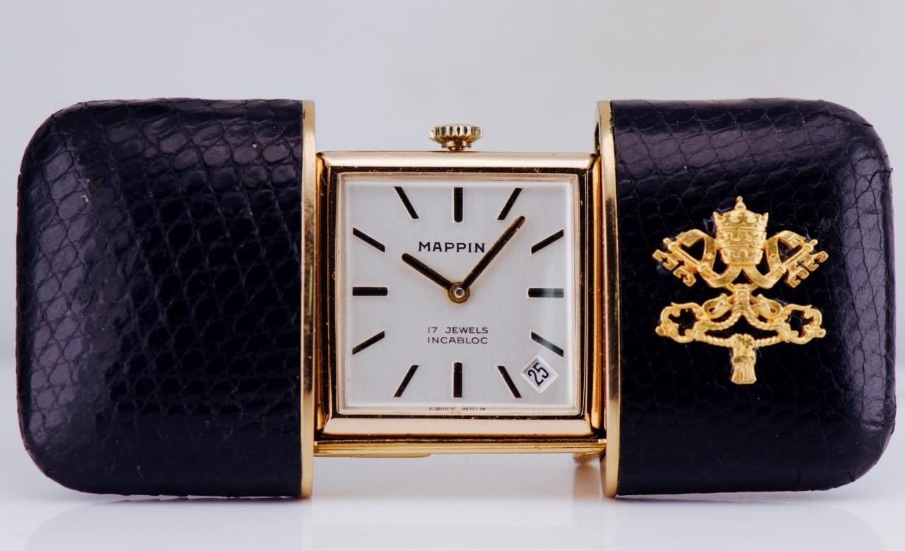Offered is a rare vintage Mappin travel desk watch, featuring a gold-plated rectangular case housed within its original leather folding travel stand, beautifully adorned with the Vatican coat of arms (Papal Keys and Tiara) in gilt.