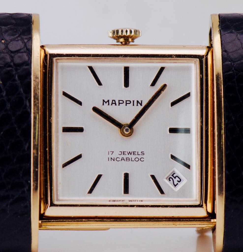 This free-standing desk/watch design was intended for travel or official use, opening into a stable desktop timepiece when unfolded. The dial is signed MAPPIN, with 17 jewels, Incabloc shock protection, and a discreet date aperture. The movement runs cleanly and keeps time as it should.