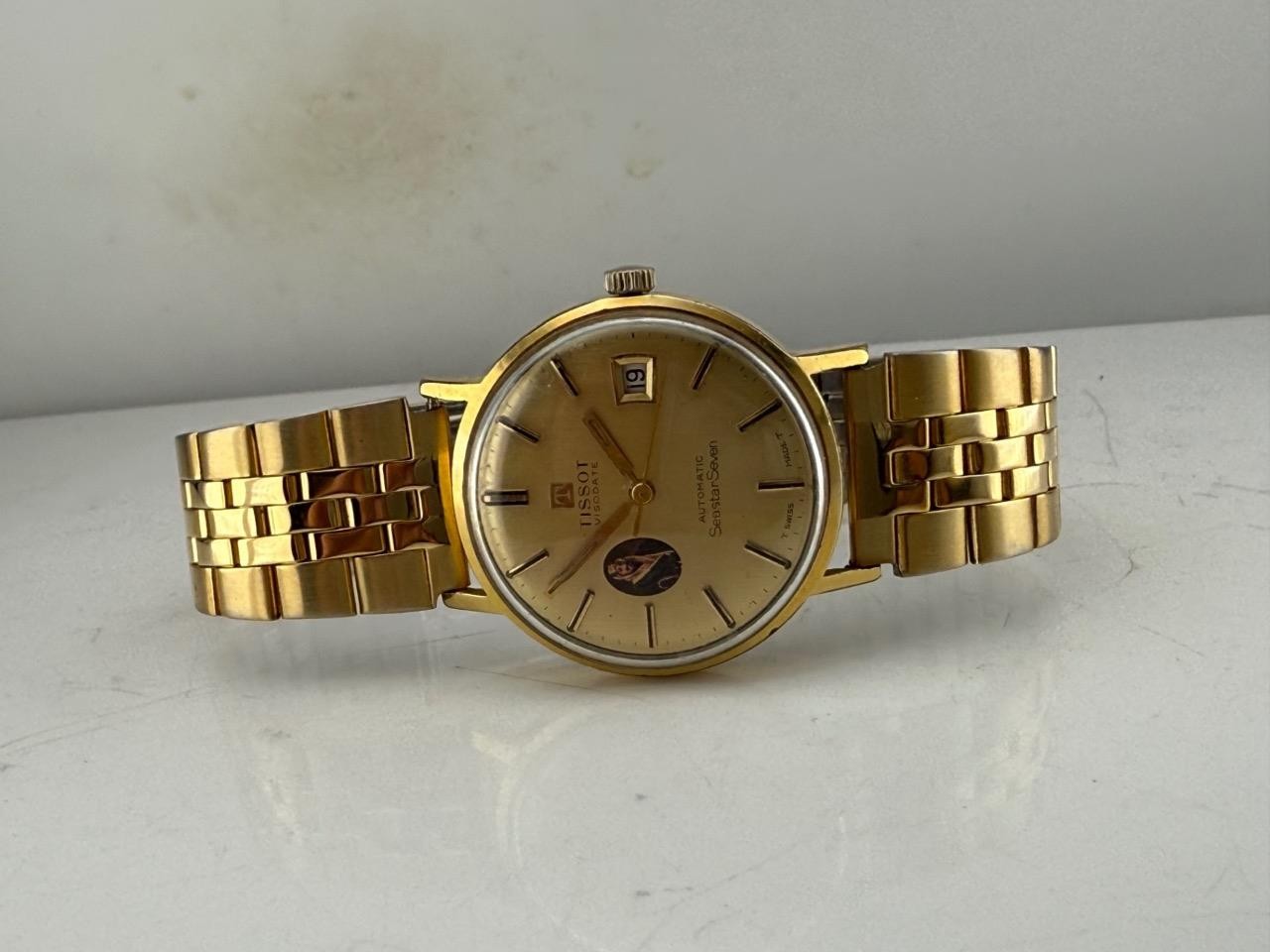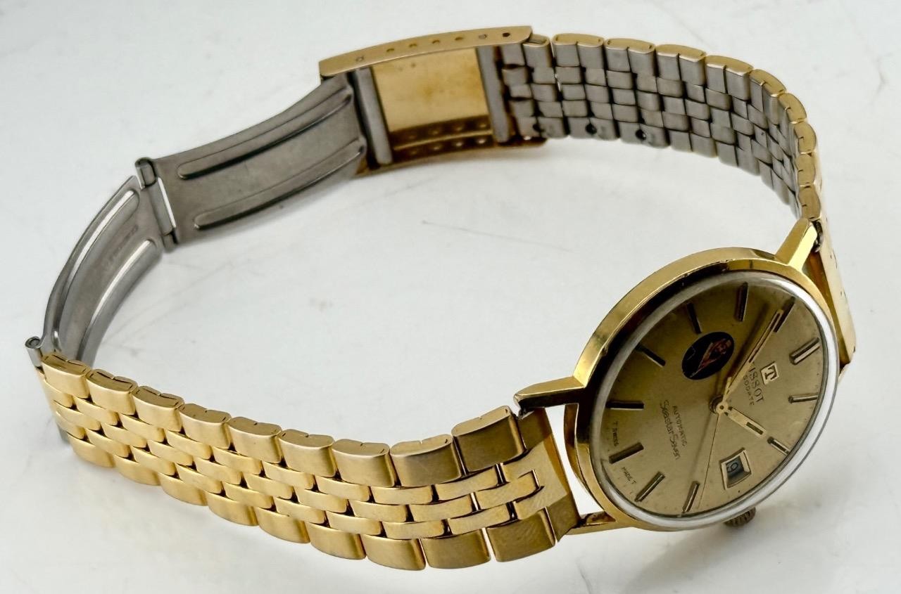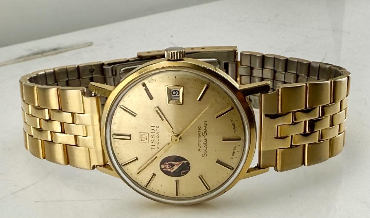 This is a rare and collectible vintage Tissot Visodate Seastar Seven automatic wristwatch, featuring a unique portrait of King Abdulaziz Ibn Saud, the founding King of Saudi Arabia, on its dial. This special edition combines Tissot’s renowned Swiss craftsmanship with a historical and culturally significant design.