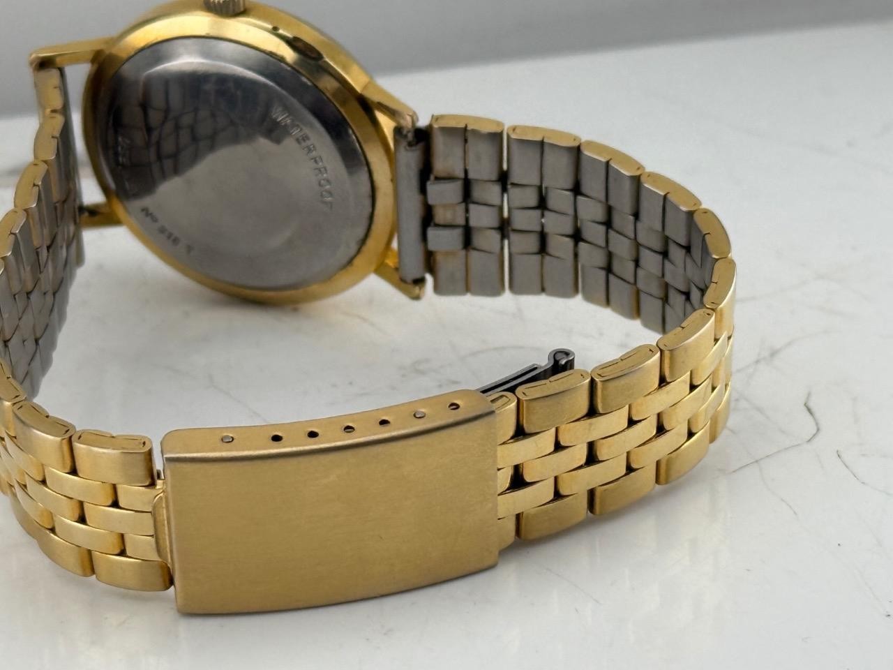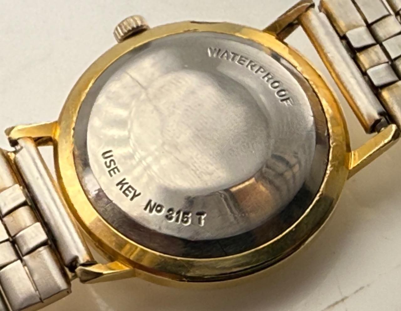 - Case Material: Gold-tone stainless steel with stainless back (marked “WATERPROOF – USE KEY NO 315”)