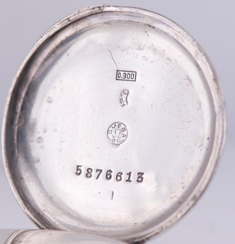 The watch houses an early Omega manual-wind movement, serial number 6017433, dating to around 1916, with matching case serial 5876613 and Swiss silver hallmark 0.900. It retains its original black enamel dial with red “12” and gilt decorative hands — typical of military-issue Omega wristwatches supplied to German and Austrian officers during the First World War.